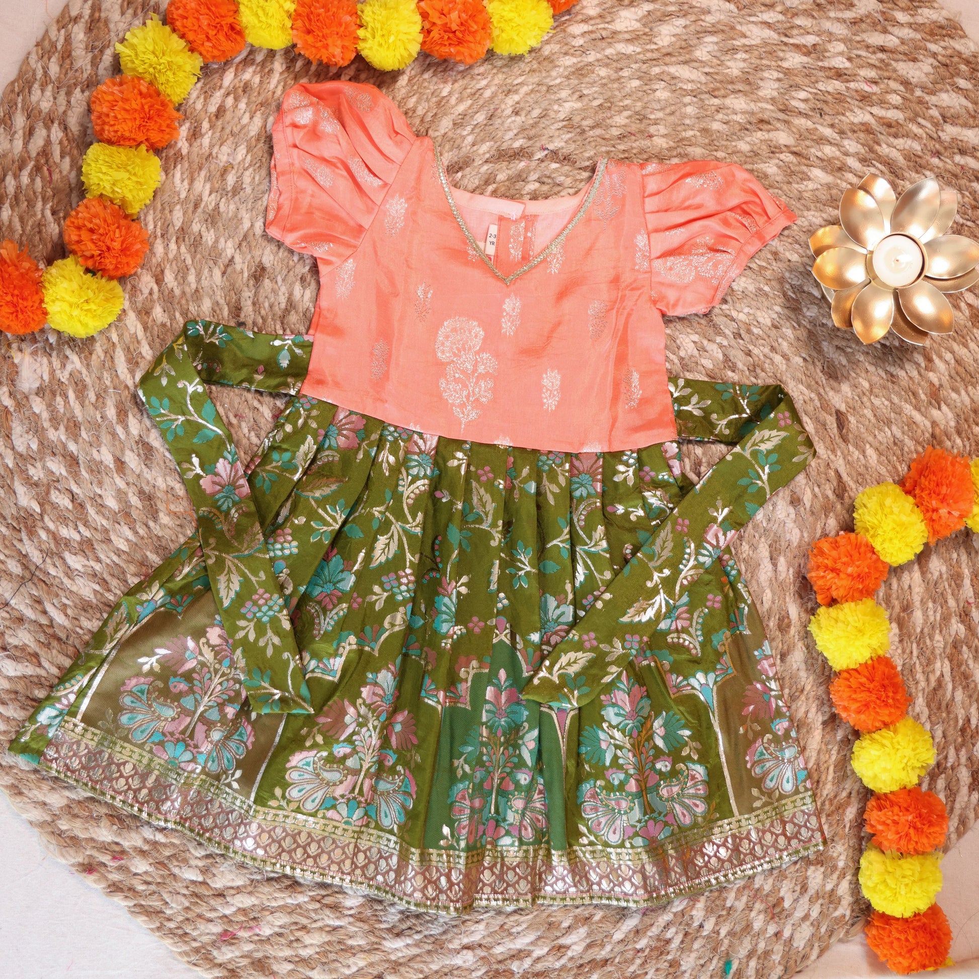 Peach & Mehendi Balloon Sleeves Frock with cotton lining